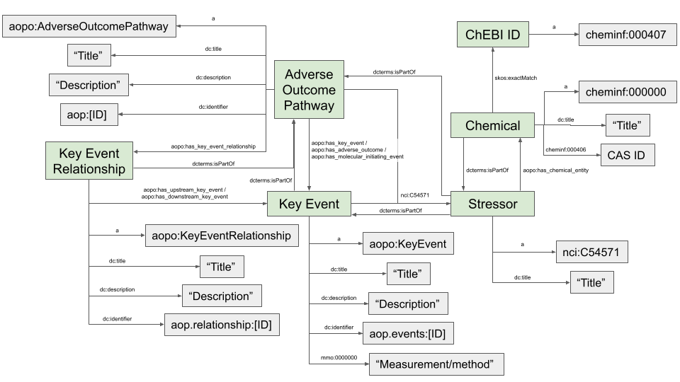 This is a simplified version of the AOP-Wiki RDF schema. Major subjects are represented in green, and their properties are highlighted in grey. The predicates are indicated on the arrows. For the complete schema description, see https://doi.org/10.1089/aivt.2021.0010.